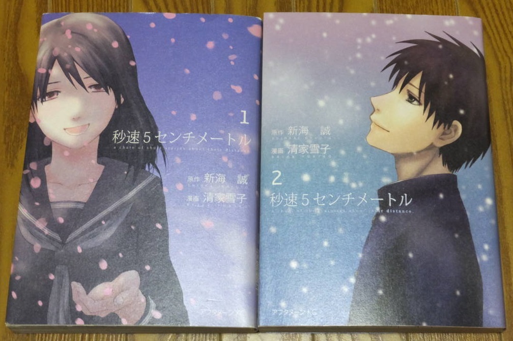 しかし、漫画版は「秒速5センチメートル」に相当する「end theme_1」、「end theme_2」、「end theme_3」とアニメ版や小説版よりも詳細に描かれている。 また、「One秒速5センチメートル 完結 著者 新海誠(原作),清家雪子(漫画) 「秒速5センチなんだって。桜の花びらの落ちるスピード」熱狂的な支持を受ける新海誠氏の長編アニメーションを漫画化! ――出